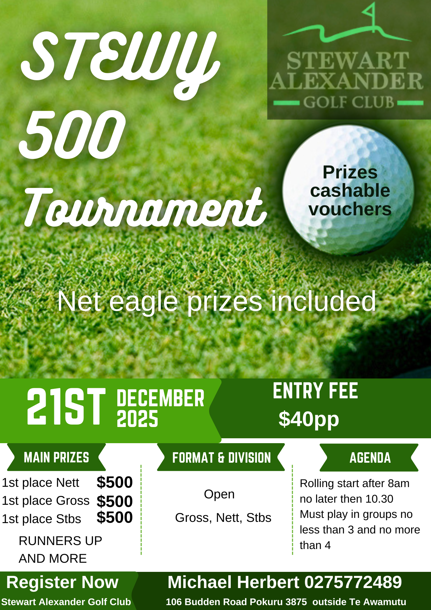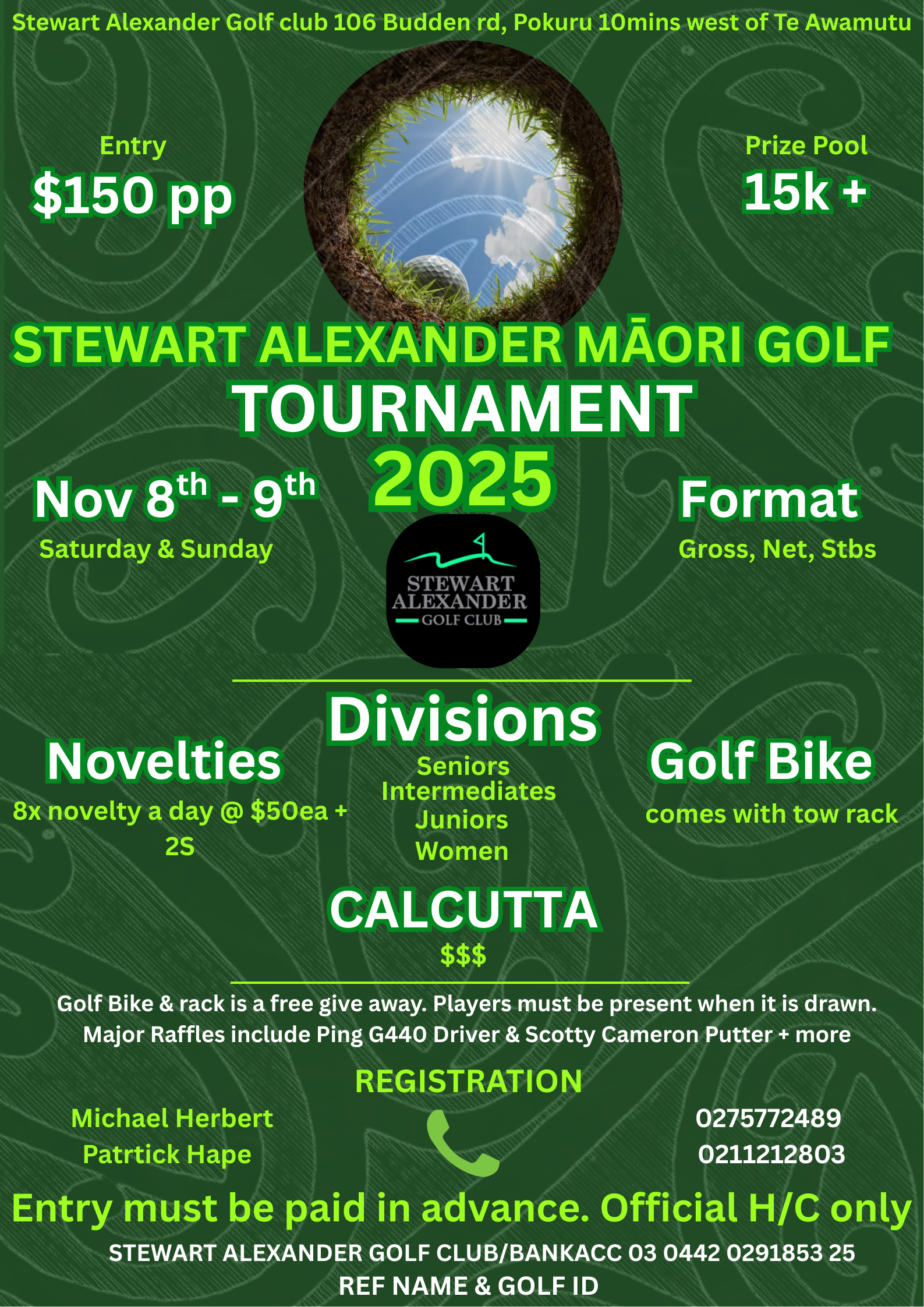 The Stewart Alexander Golf Course was opened in 1971 at its current location, and is situated just 6km south west of Te Awamutu at 106 Budden Road, Pokuru. Stewart Alexander is a superb course on a rolling contour, in an attractive setting with rural views. Defined fairways lined with mature trees and excellent greens make our course appealing all year round, to golfers of all handicaps.